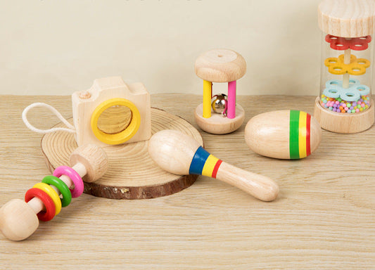 Montessori Early Education Wooden Baby Teething Soothing Hand Rattle 6Sets Combination Set Educational Toys,Wooden Rattle for Boys Girls, Rattle Toys for Babies